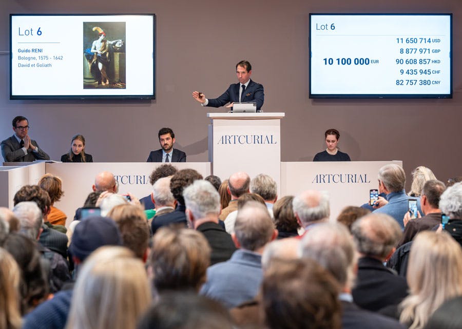 Devant une salle comble, David et Goliath de Guido Reni, œuvre magistrale du XVIIe siècle redécouverte après plus de deux cents ans, a été vendue 12 386 600 €, réalisant ainsi le record du monde pour un tableau de l’artiste vendu aux enchères et devenant la peinture de maître ancien la plus chère vendue à Paris en 2025.